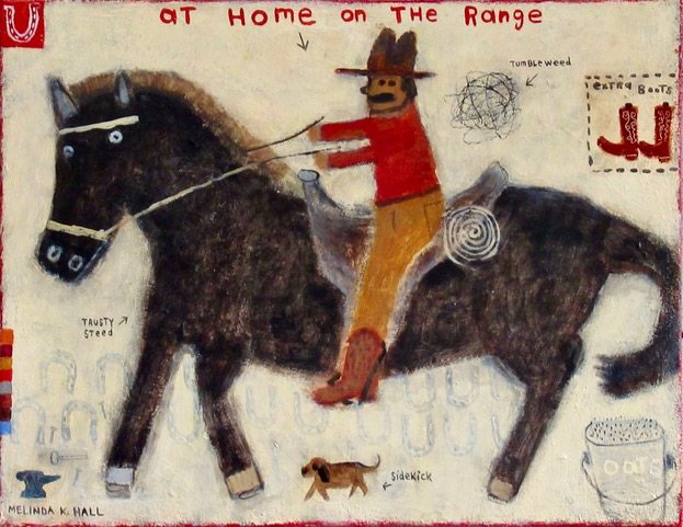 In her work Melinda K. Hall captures ordinary objects and simple pleasures.  Her multi-layered canvases are infused with humorous elements, playful images, vivid colors, doodles and text, allowing the viewer to join in her sophisticated, childlike exploration of life.  Known as a narrative painter, Hall’s canvases become her story-telling playground, a place of creative license where she combines both research and imagination.  Melinda’s work has been seen in gallery and museum venues, public and private collections since 1990.