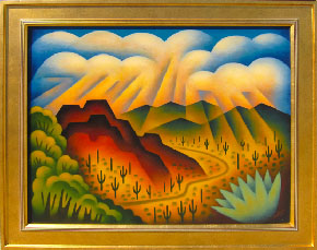 Fran Larsen’s “road” paintings give the viewer birds eye views of roads traversing electric colored mountains and valleys while, Sushi Felix’s trails lead through and around subtle Sonoran rock formations complete with native flora and fauna.