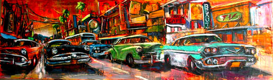 Serene country sides change to bustling city streets with Bill Colt’s nostalgic mixed media renditions of classic cars “making the drag”.