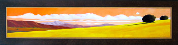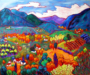 Jeff Cochran presents almost eerie predawn settings, using atmospheric perspective, often including a few suggestions of cattle grazing, which contribute to the serenity. Barbara Gurwitz paintings show tranquil villages composed of vivid colors. The villages show no inhabitants. Are they deserted, or is everyone in church?