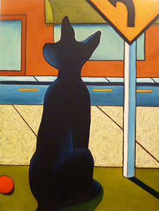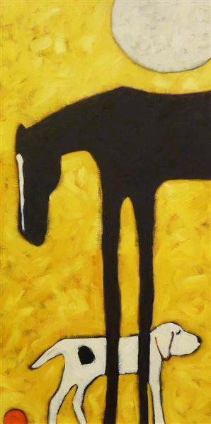 Ellsworth’s varied series of paintings feature stylized animals in various states of interaction either with each other or their surroundings.